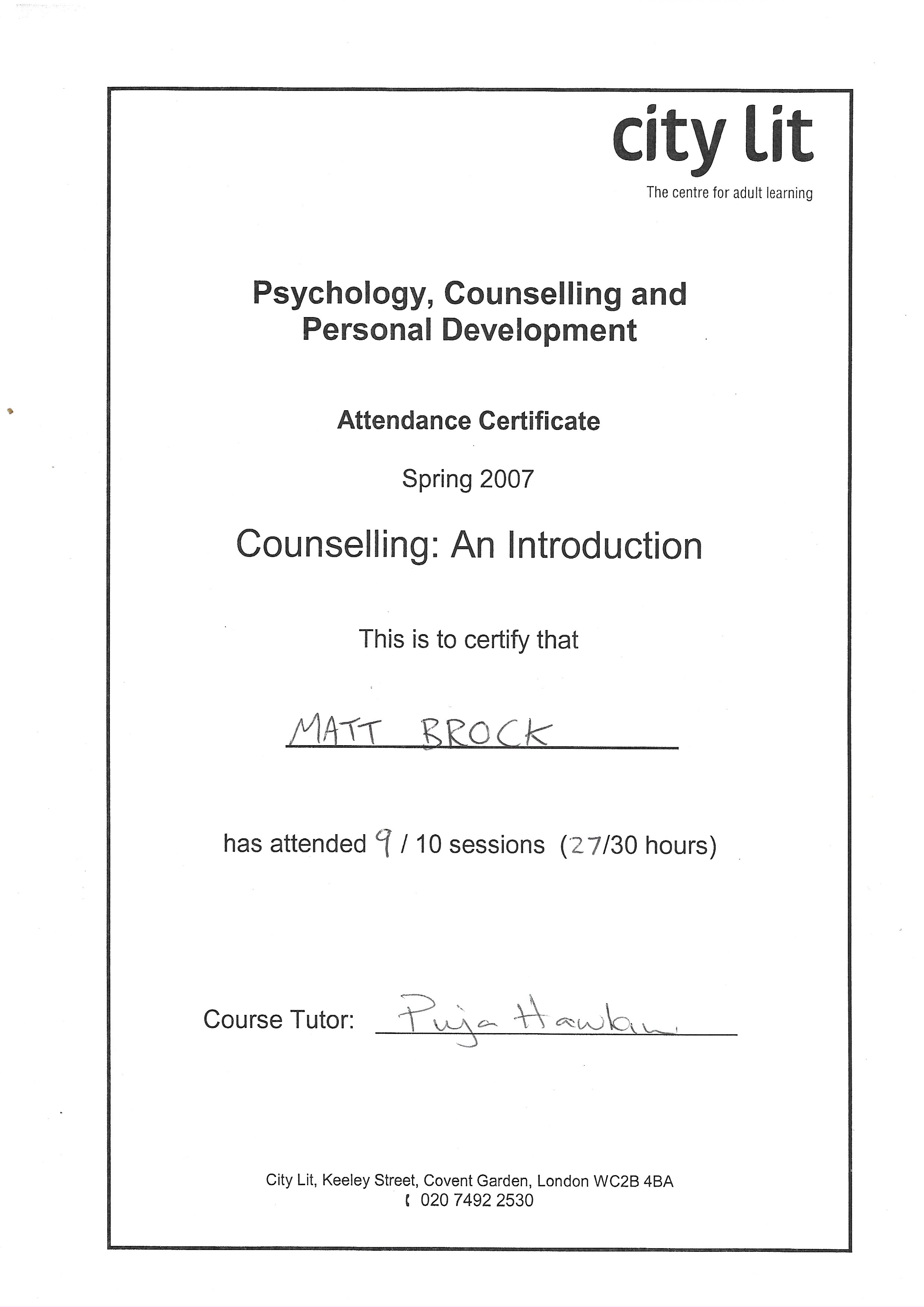 counselling course at City Lit in 2007, and I’ve subsequently had the
